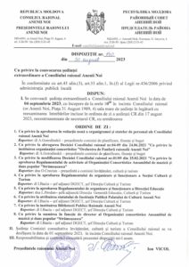 Dispozitia presedintelui raionului nr.140 din 30.08.2023 Despre convocarea sedintei extraordinare a Consiliului Raional