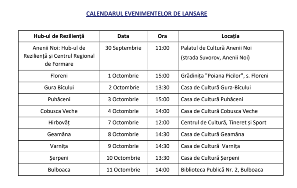În perioada 30 septembrie-11 octombrie 2024 în raionul Anenii Noi se lansează oficial rețeaua de HUB-uri de reziliență în cadrul Proiectului STRIVE – un proiect pilot condus de organizațiile ACTED, Bibliotheques Sans Frontieres și REACH, finanțat de Agenția Franceză de Dezvoltare — o inițiativă inovatoare care își propune să consolideze capacitatea comunităților de a face față dezastrelor naturale și antropice. Aceste centre comunitare, amplasate strategic în 10 biblioteci publice în comunitățile Anenii Noi, Geamăna, Șerpeni, Hîrbovăț, Gura Bîcului, Floreni, Varnița, Cobusca Veche, Bulboaca și Puhăceni, vor oferi resurse, informații și instrumente esențiale pentru a construi o societate mai rezilientă.